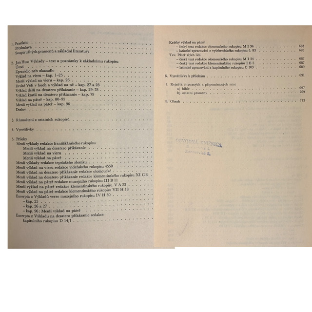 Ed. Magistri Johannis Hus - Opera omnia, zv. 1.- Príprava vydania: Komise pro vydávání spisů M. Jana Husa pri ČSAV.- Náklad 1200 výtlačkov.- Predtitulná stana neprítomná, staré pečiatky knižnice a knižničné poznámky na zadnej strane titulného listu a na poslednej strane malá pečiatka.- Papierová obálka po okrajoch len minimálne odzobaná, inak dobrý stav