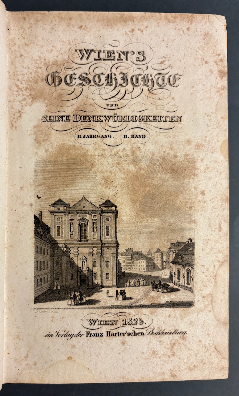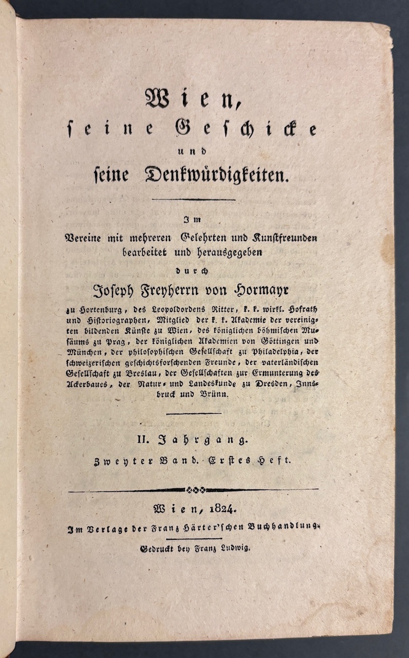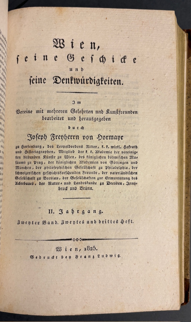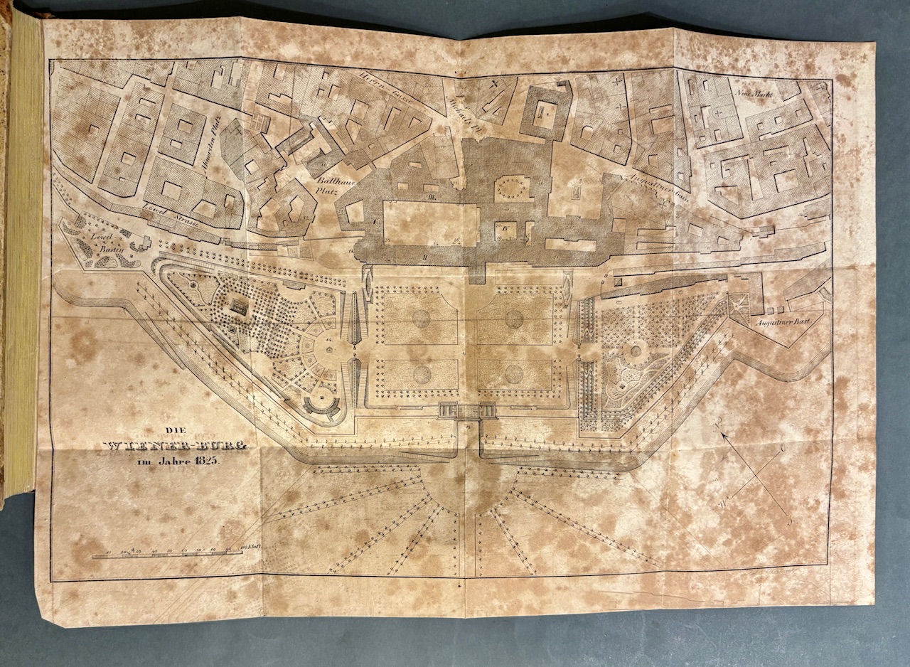 Ausführliches historisch-topographisches Werk zur Geschichte Wiens.- Gest. Titelbl., Heft 1 mit 1 gefalt. lithogr. Tafel (braunfleckig), Heft 2 1 gefalt. figürliche und 1 gefalt.architektonische lith. Tafel Plan der Winer Burg im Jahre 1825 (stark braunfleckig).- Seitenanzahl: 201, LXII (Urkundenbuch)., 88, CCLXVI (Urkundenbuch).- Vorsatz mit altem handschr. Eintrag. Zeitgenössischer Halblederband mit braunem Lederrücken und marmorierten Pappdeckeln. Der Rücken ist reich goldgeprägt mit Titel, Jahresangabe und ornamentalen Fileten sowie Bandnummer. Solide Bindung, altersgemäße Kanten- und Rückenberieb, insgesamt gut erhalten