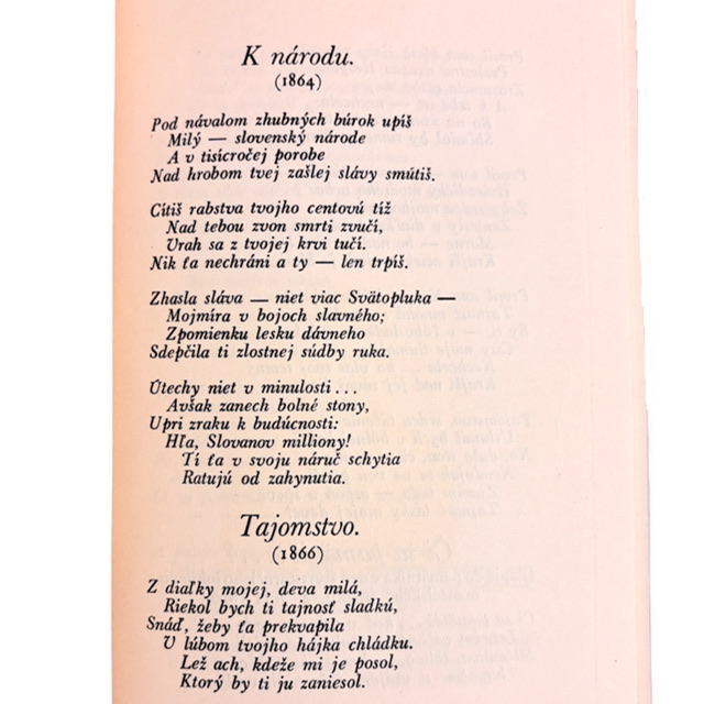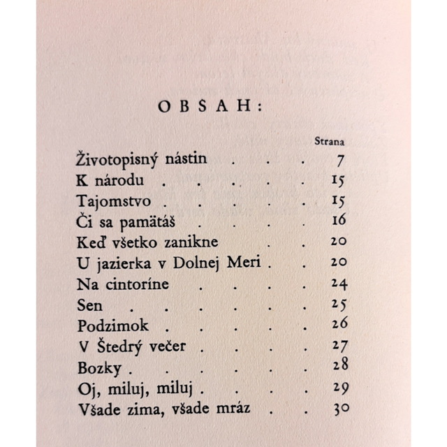 Samostatne vydaná bibliofilská zbierka 12tich básní.- 1. vydanie. Edície Krásna kniha, zv. 7. ktorá patrí k vrcholom slovenskej medzivojnovej knižnej kultúry. Náklad 270 číslovaných exemplárov (tento č. 84).- Životopisná štúdia Vladimír Polívka.- Graficky upravil samotný riaditeľ Slovenskej Grafie Karol Jaroň.- Horný roh obálky trochu zažltnutý, inak veľmi pekný stav