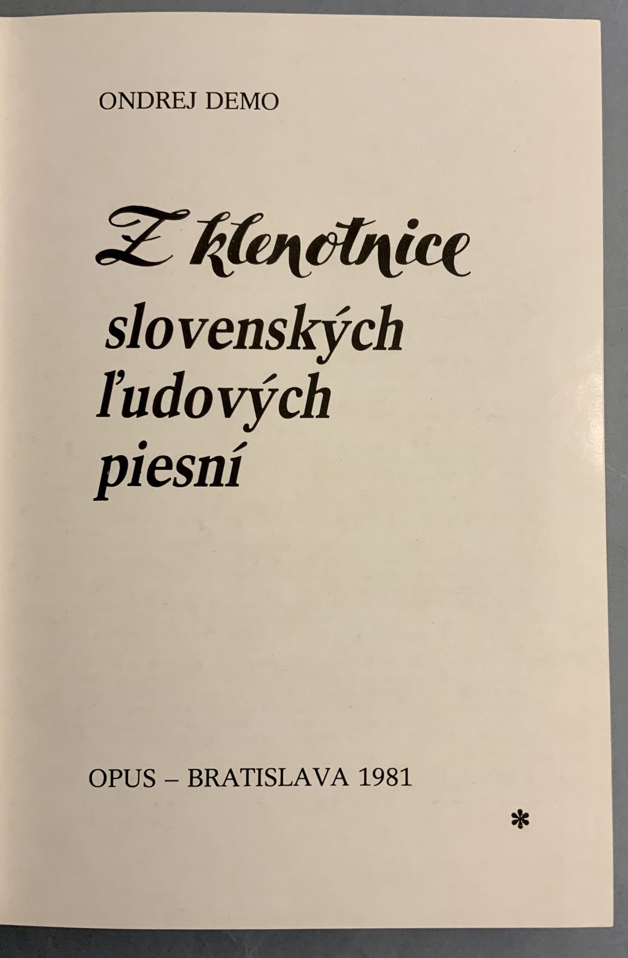 Reprezentatívna zbierka slovenských ľudových piesní zachytených v autentickej podobe s notovým zápisom, textami a sprievodnými údajmi o pôvode. Publikácia vychádza z dlhoročnej dokumentačnej a zberateľskej práce Ondreja Dema a predstavuje výber piesní ako živé svedectvo hudobnej pamäti slovenského vidieka. Kniha má nielen hudobno-etnografickú hodnotu, ale aj silný kultúrny a emocionálny rozmer. Súbor 477 piesní z 58 slovenských obcí doplnených tematickými zväčša čb fotografiami, na kriedovom papieri. Vhodná voľba pre tých, ktorí hľadajú dôstojný a hodnotný dar s hlbším kultúrnym významom — pre milovníkov tradícií, hudby a všetkých, ktorí ocenia knihy s trvalou hodnotou a autentickým obsahom.- Papierová obálka na hornom okraji trochu ošúchaná, inak pekný stav